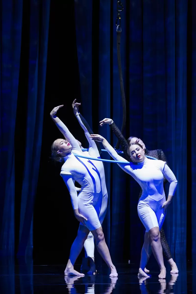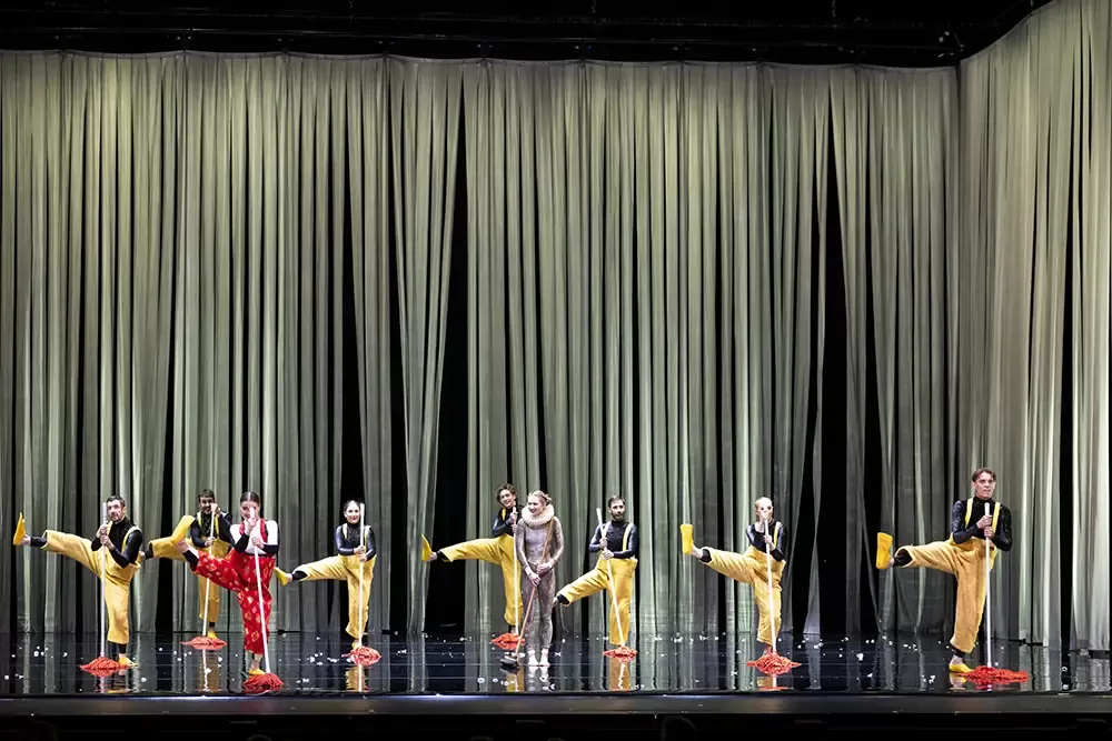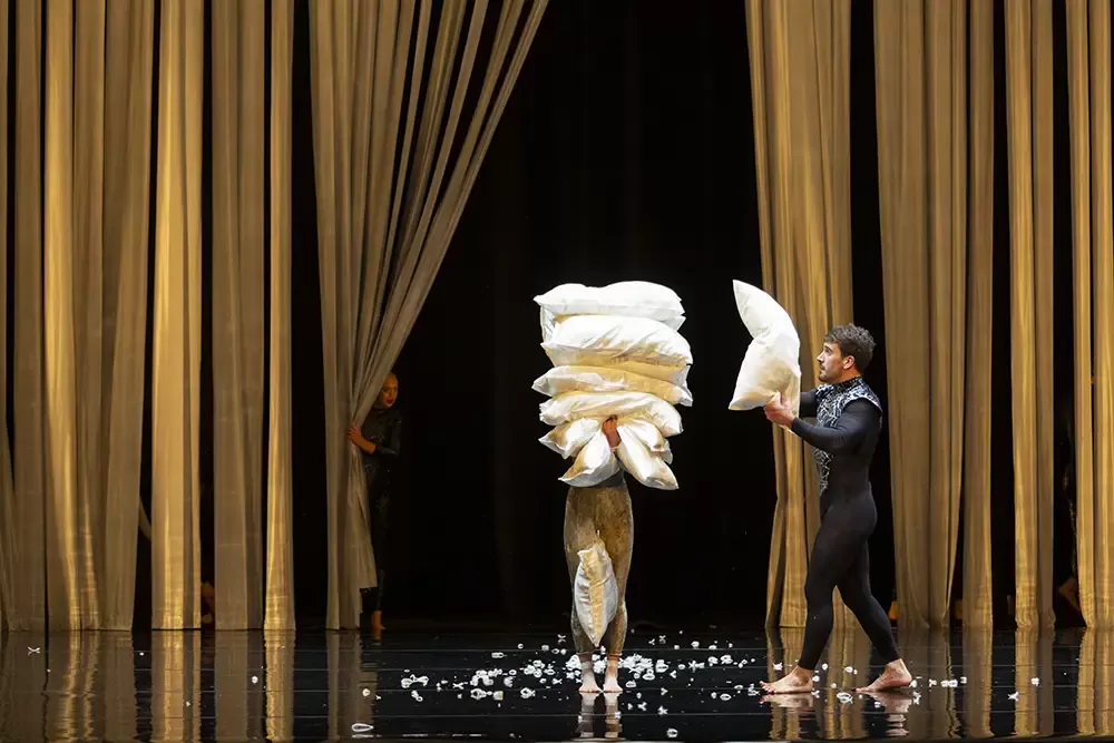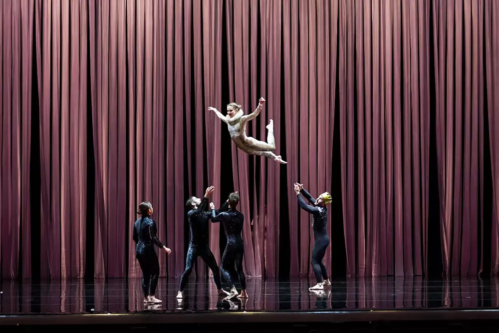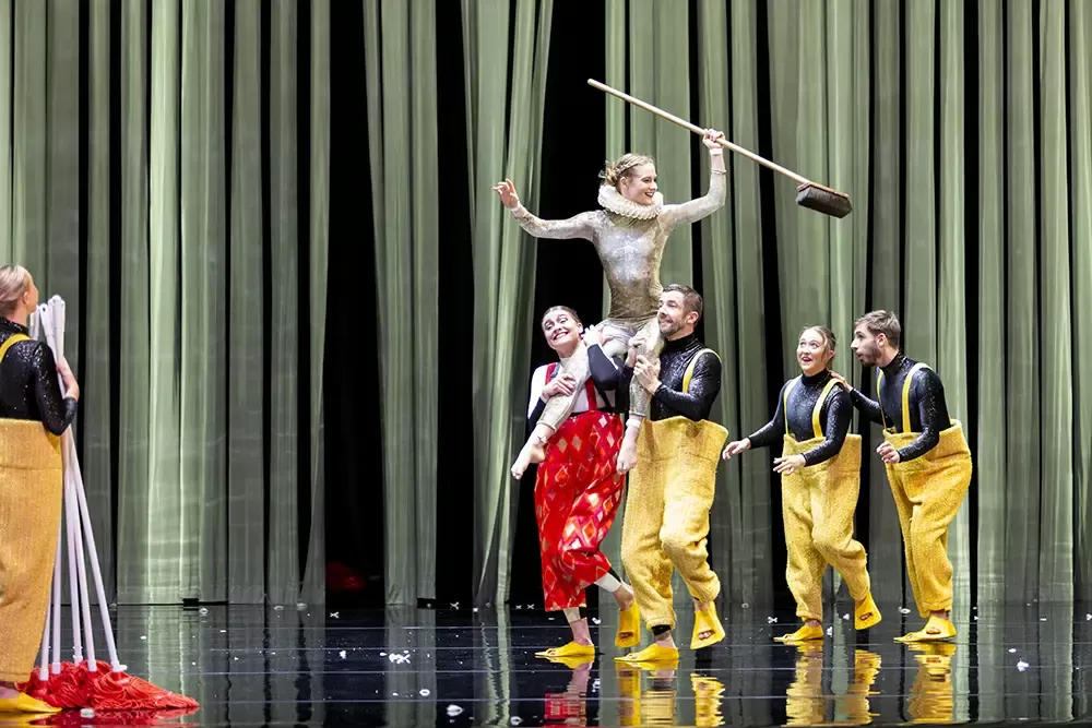 In Duck Pond, elements of Tchaikovsky’s iconic ballet and Hans Christian Andersen’s beloved parable The Ugly Duckling leap headlong into the pool together. Performers leap, tumble, and proffer topsy-turvy takes on the roles of pining prince, black swan, and an army of yellow billed duck-dancers in sequinned flippers. The result is a circus marvel, glittering with theatrical magic and laughter, all cued up by the words “Once upon a time.”