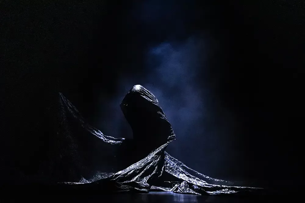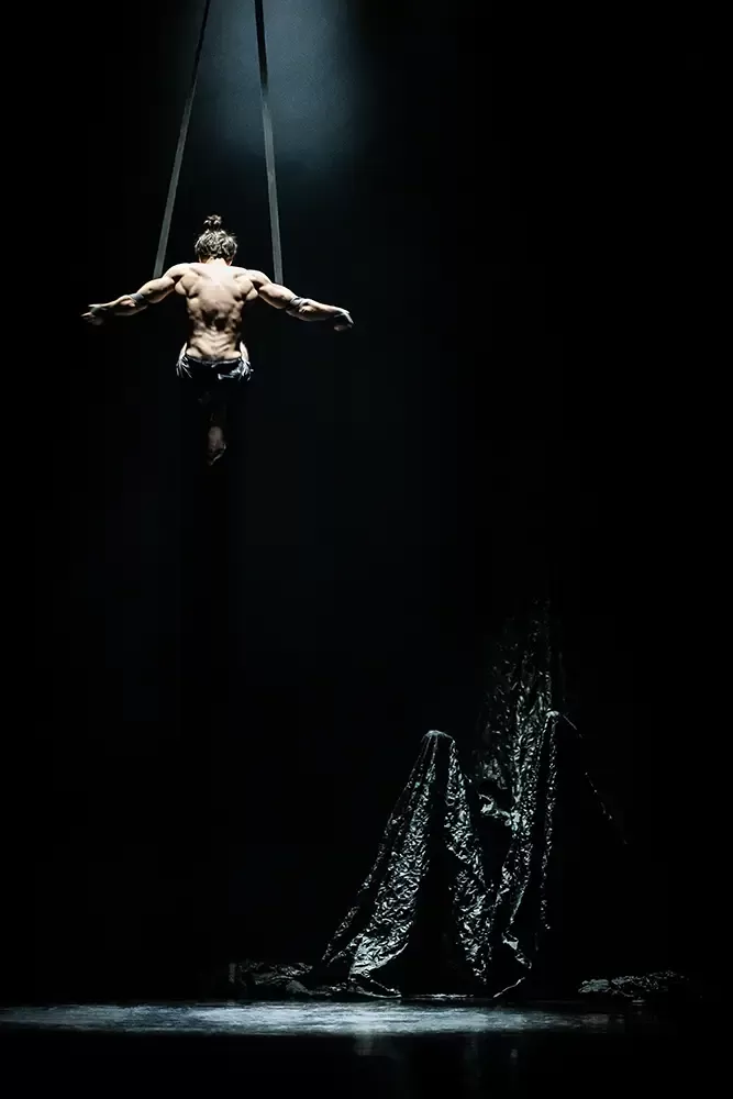 With its reference to a post-apocalyptic world, Paradisum summons archetypal figures, each engaged with the overwhelming effort of existence. Elevating aerial and groundwork, elements of stagecraft — a rippling black drape, a ladder, rings, a hoop — create otherworldly vistas. Underpinning the larger cosmological ideas with concrete manifestations, the work is both deeply grounded in the earth and yet defiant of gravity.